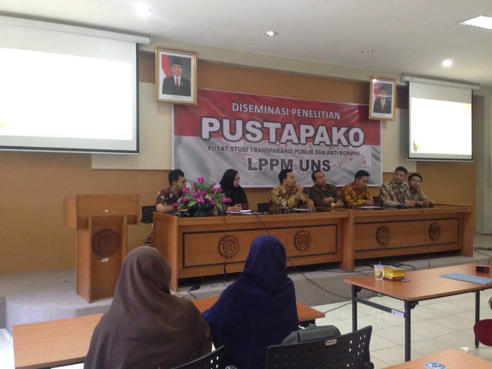Surakarta, 20 Agustus 2015 PUSTAPAKO (Pusat Studi Transparansi Publik dan Anti Korupsi) telah melaksanakan acara diseminasi penelitian yang merupakan penelitian-penelitian yang telah dilakukan selama satu tahun terakhir semenjak berdirinya di Universitas Sebelas Maret. Acara disemniasi dilaksanakan pukul 09.30 di ruang sidang 1 LPPM UNS, Universitas Sebelas Maret, Jl. Ir Sutami no.36A, Kentingan, Jeberes, Surakarta 57126. Acara tersebut di buka oleh pimpinan LPPM.